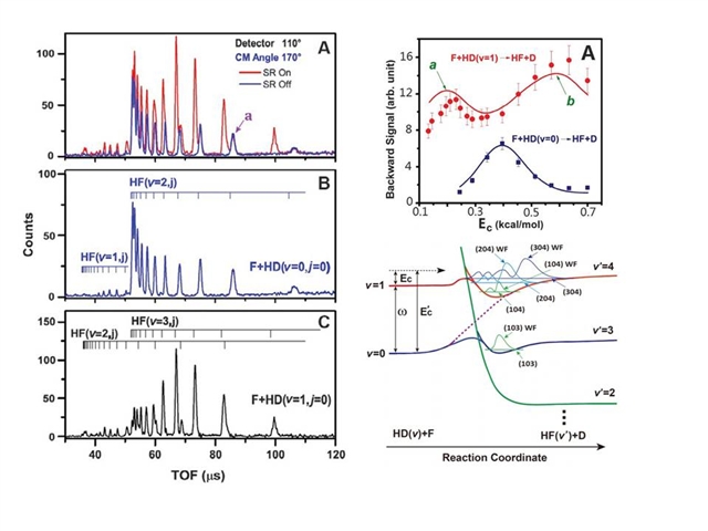 利用该实验技术,他们对F+HD(v=1)反应进行研究。F+H2/HD是经典的放热三原子反应,2006年杨学明、张东辉等人在F+H2反应中观察到反应共振态(Science 311, 1440, (2006)), 2010年,他们又在F+HD反应中观察到分波共振态(Science 327, 1501 (2010)),这些共振态都是在产物HF(v’=3)的绝热振动曲线上形成的。对于F+HD(v=1)反应,实验发现在后向散射信号随碰撞能的变化曲线上存在振动现象。为解释实验发现,张东辉等人进一步提高了他们2008年所拟合的F+H2体系势能面的精度。在新的势能面上,理论与实验取得了高度吻合。理论研究证实实验所观察到的振动现象是由束缚在产物HF(v’=4) 绝热振动曲线上的两个共振态所引起的。更有意义的是,研究发现HF(v’=4) 绝热振动曲线在反应物端与HD(v=1)态相关联,因而它们只能通过HD的振动激发来探测,而不能通过平动能的增加而进入。