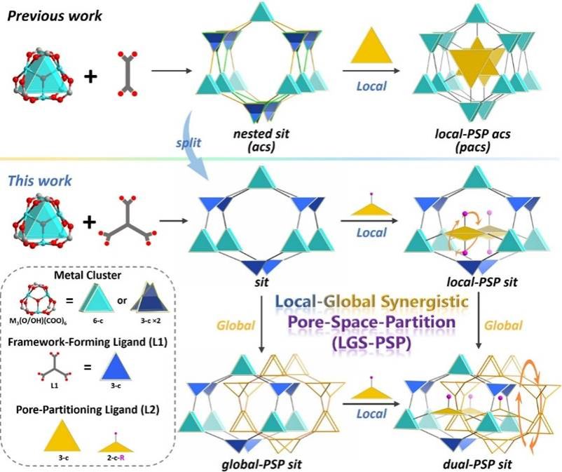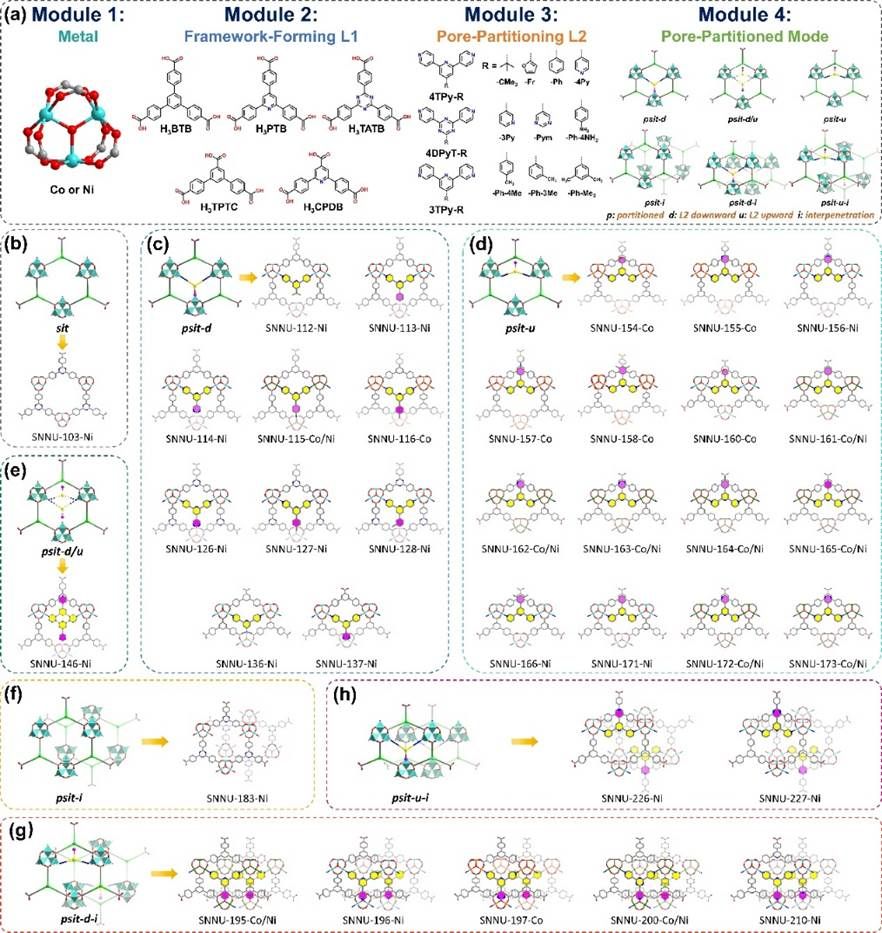 分区MOF的构筑依赖于金属节点、配体与拓扑结构的协同作用,通常将具有合适尺寸和配位能力的分区配体(L2)插入框架中相邻的不饱和配位金属位点实现。本研究采用3-连接的框架形成配体(L1)替代acs拓扑中部分六连接三核簇节点,从而实现了从acs到sit网络的拓扑转变。sit网络中两个相邻的三核簇节点为L2配体的构型与取向提供了更大的空间兼容性,极大拓展了分区调控的灵活性和可设计性。